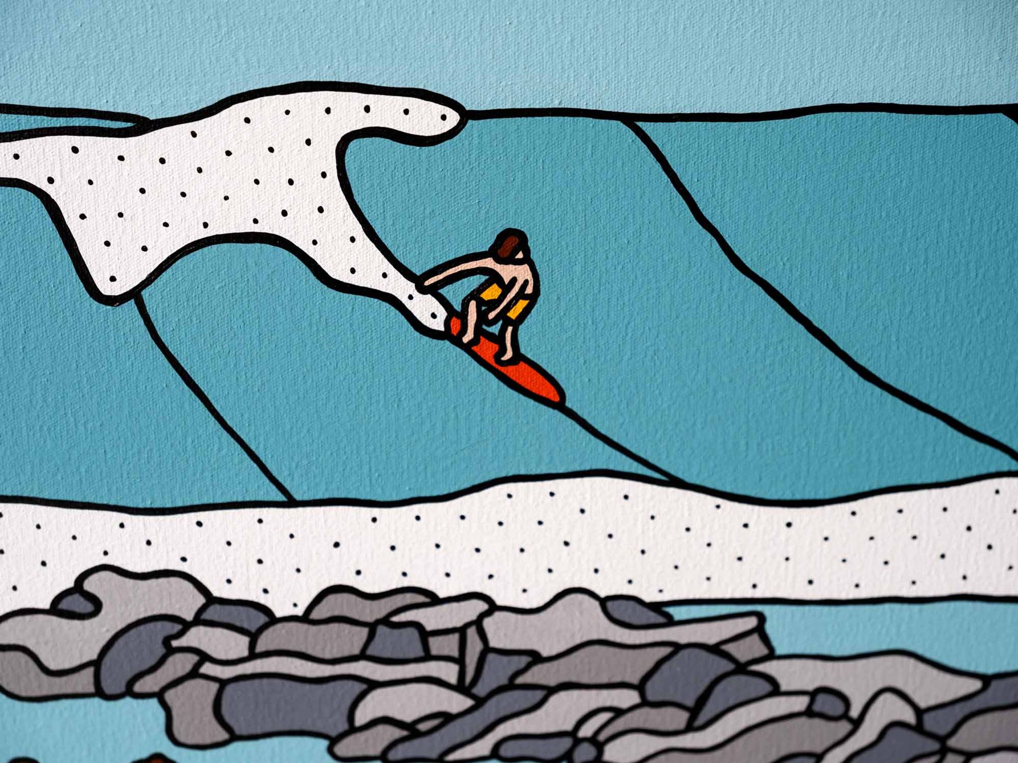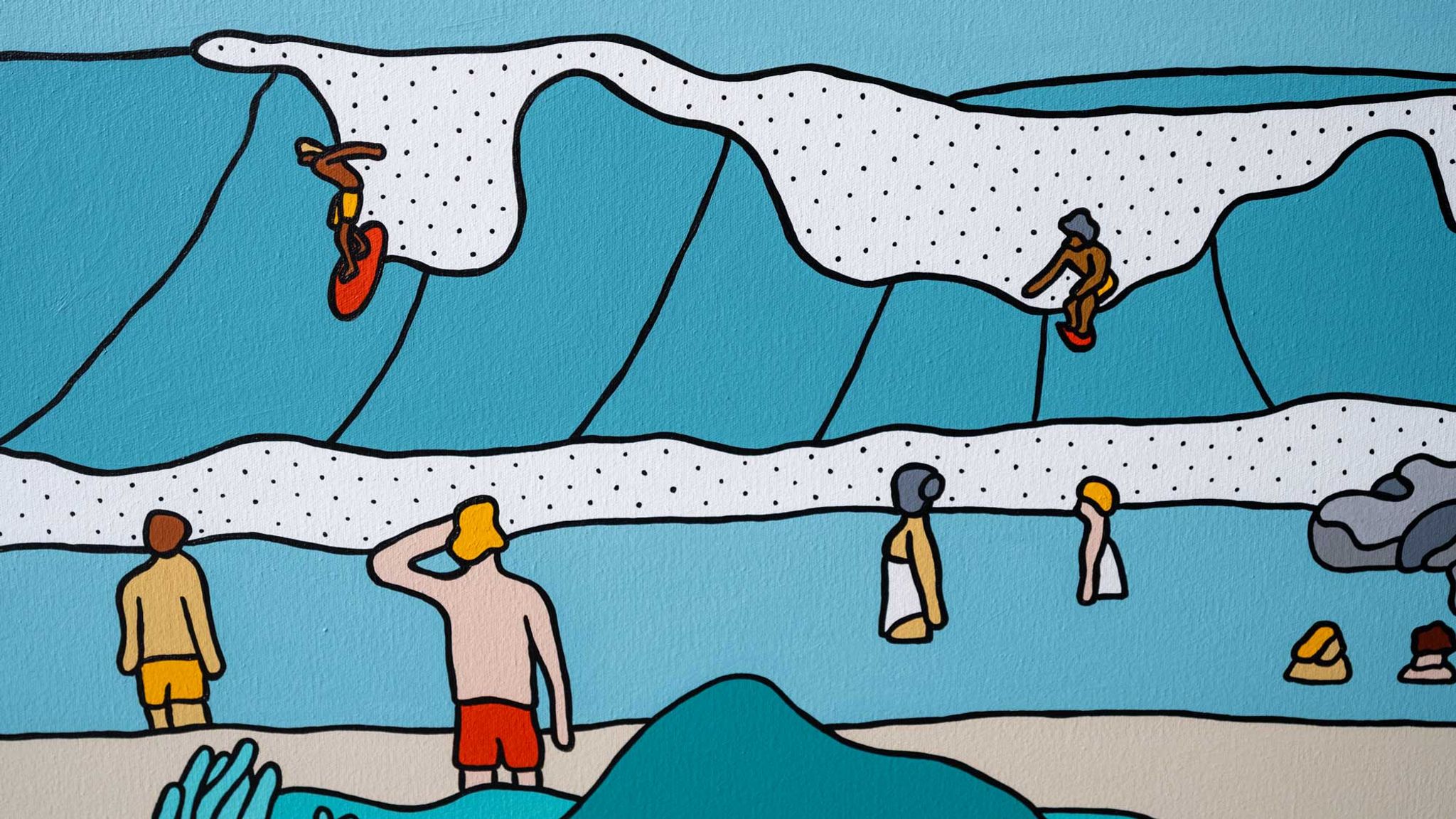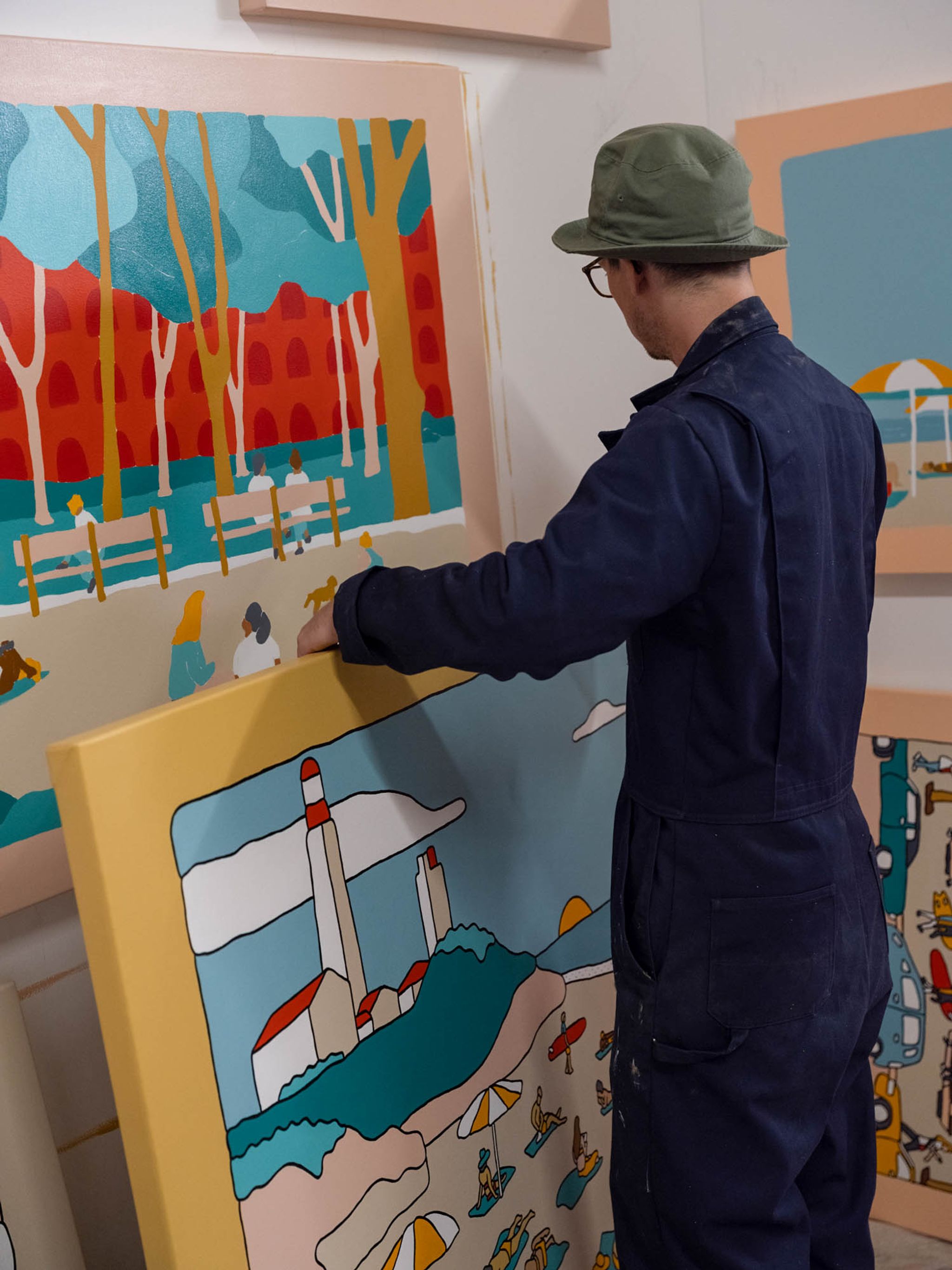 The show is called ‘Solitude Safari’. Its about living in NYC in all the chaos, and how folks find piece and tranquility in between. I got so enamored by how everyone is on their phone roaming the city (me included) that I found myself drawing these characters in my sketchbook on a daily basis. The more I peeled the layers back, the more I noticed folks being content in their surroundings. Whether that be going to the beach, the park, the balcony, or even just pulling out a bbq on the front porch of their house in the streets. Folks all over found this peace.