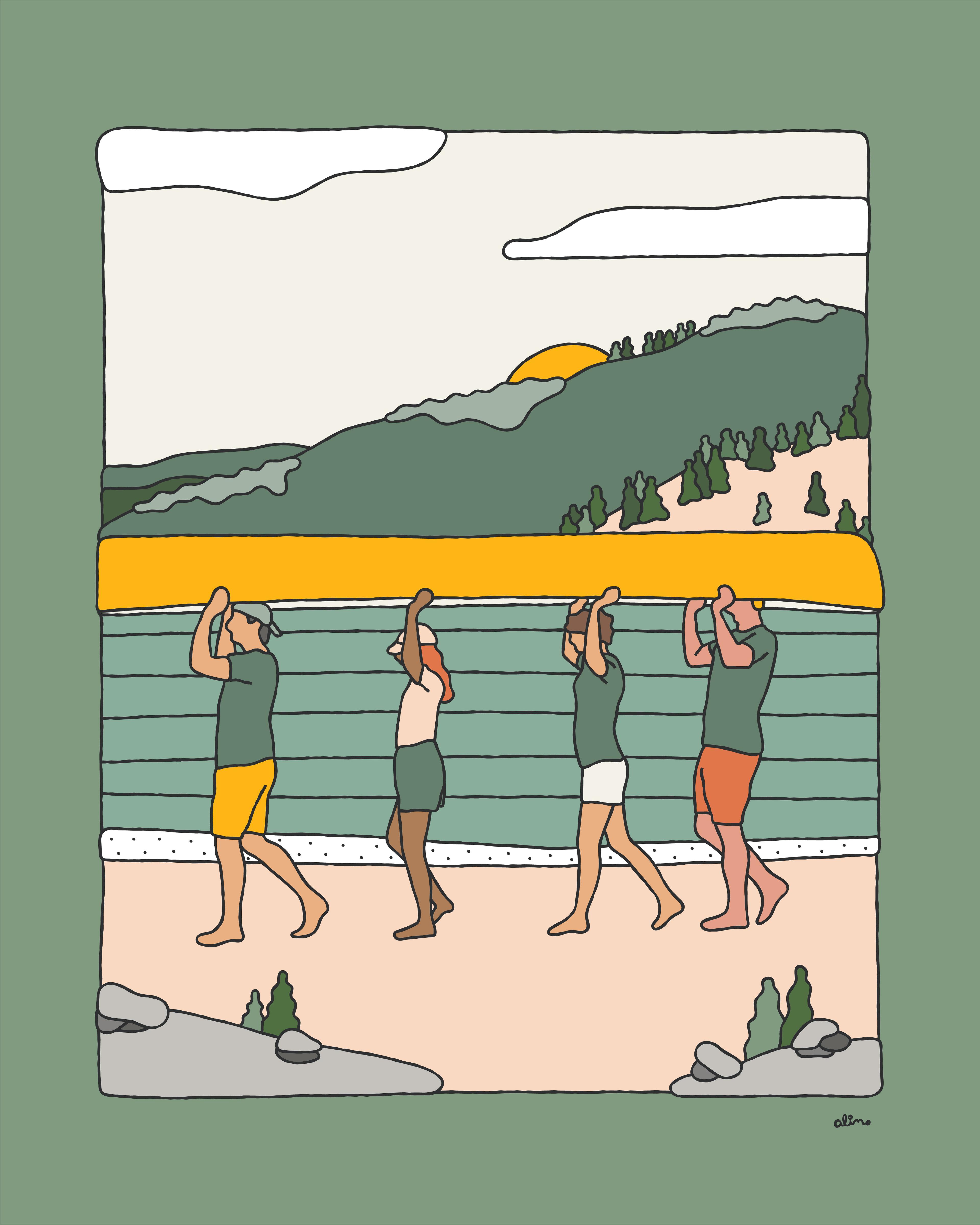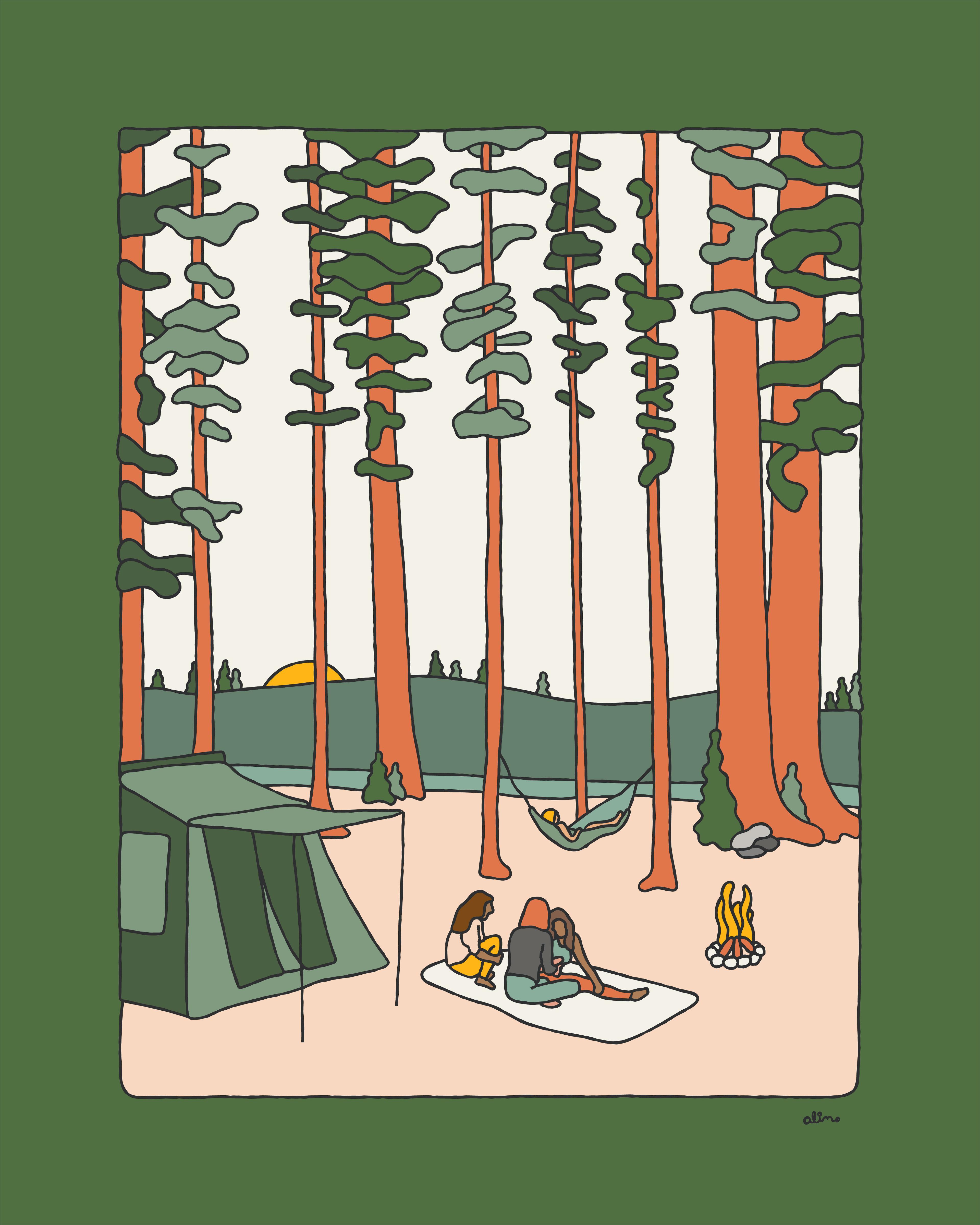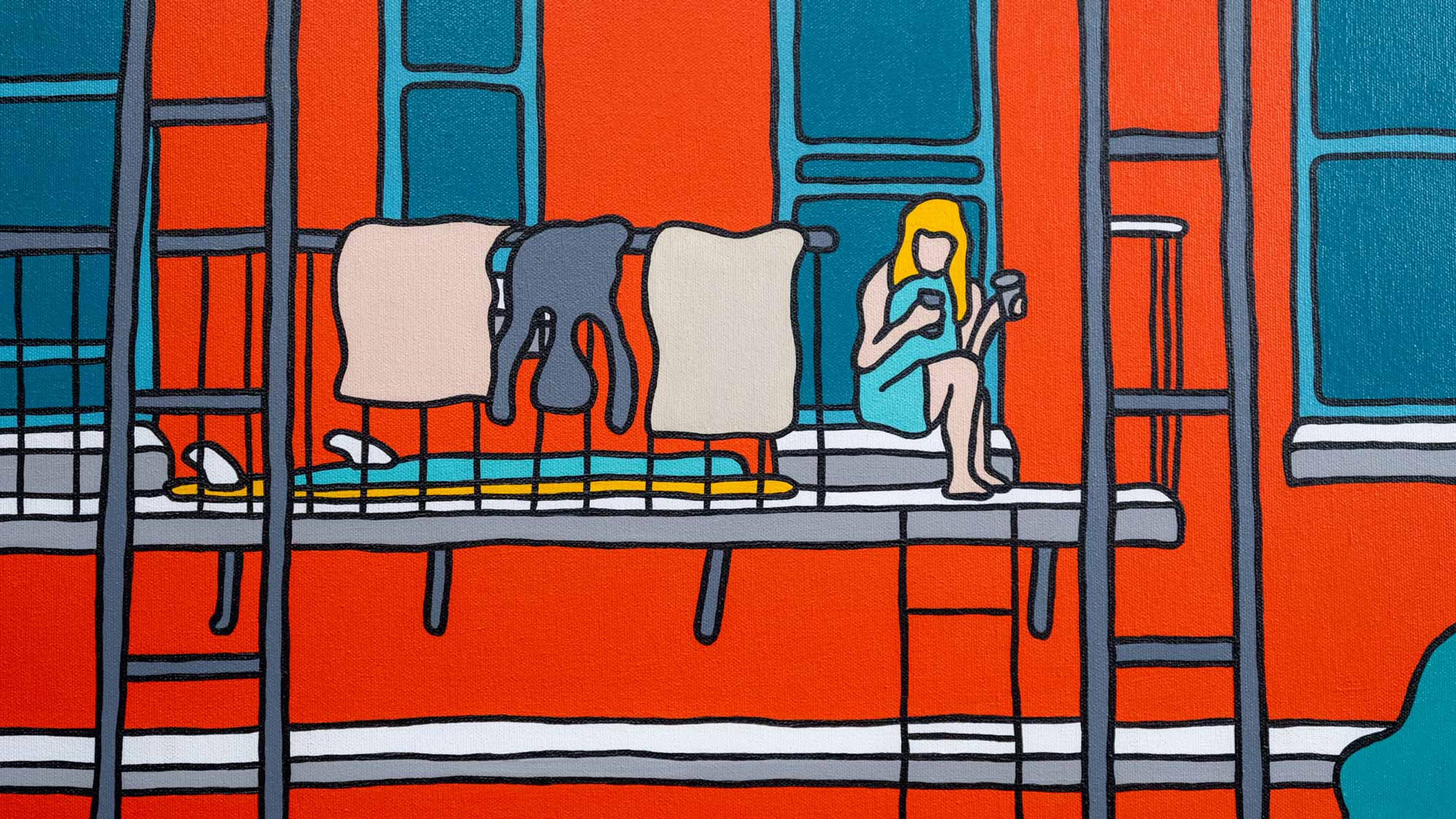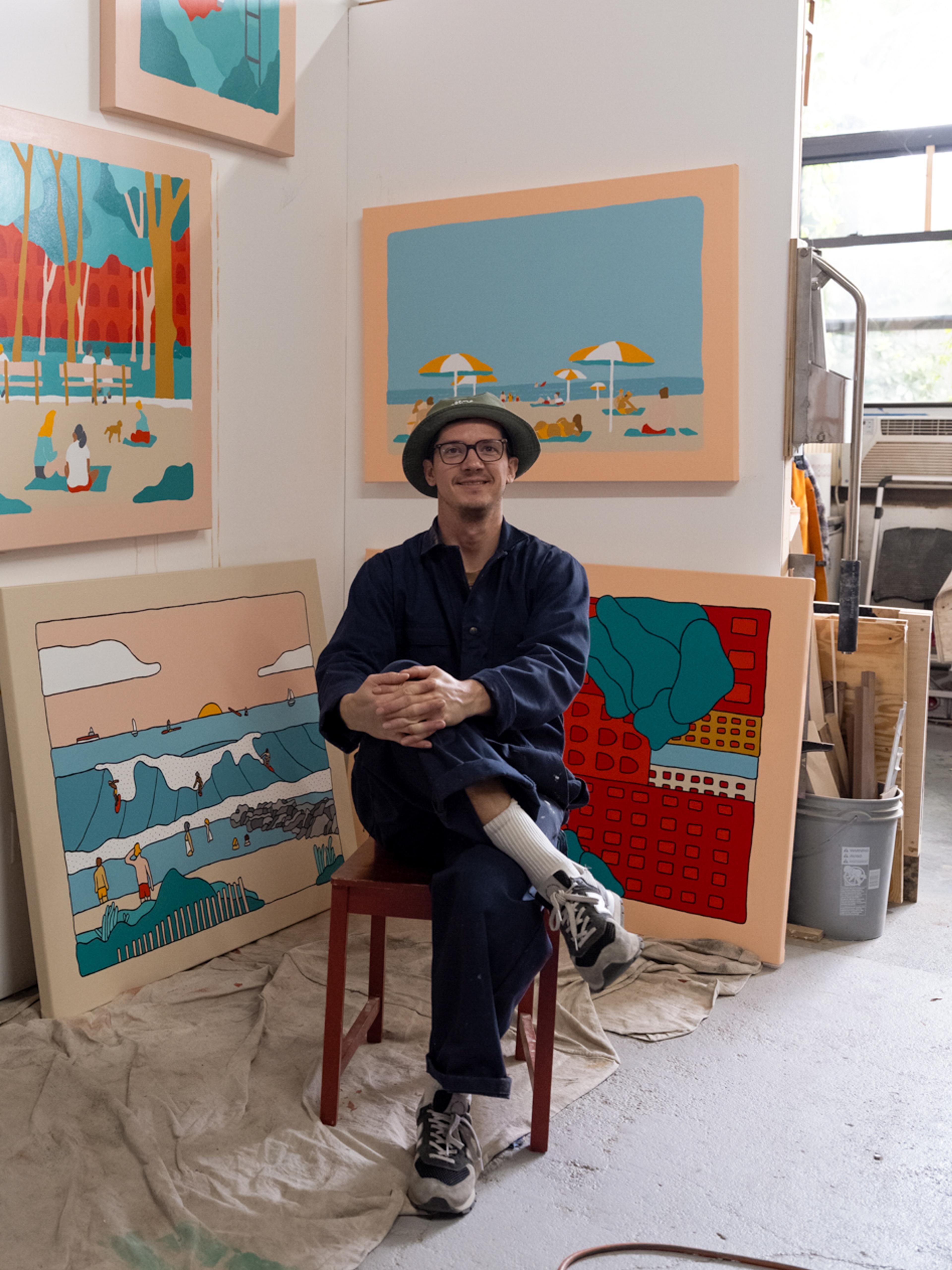 The show is called ‘Solitude Safari’. Its about living in NYC in all the chaos, and how folks find piece and tranquility in between. I got so enamored by how everyone is on their phone roaming the city (me included) that I found myself drawing these characters in my sketchbook on a daily basis. The more I peeled the layers back, the more I noticed folks being content in their surroundings. Whether that be going to the beach, the park, the balcony, or even just pulling out a bbq on the front porch of their house in the streets. Folks all over found this peace.