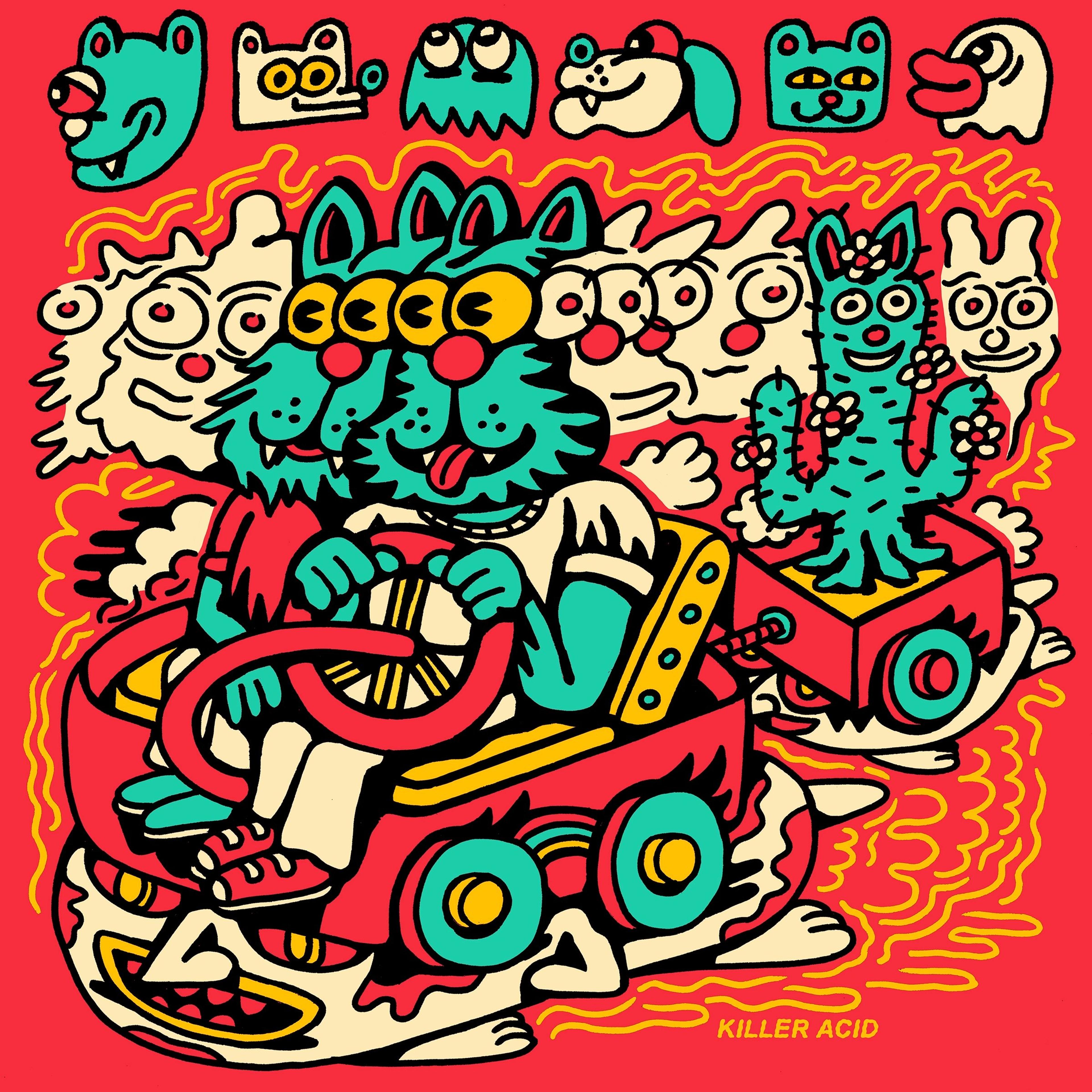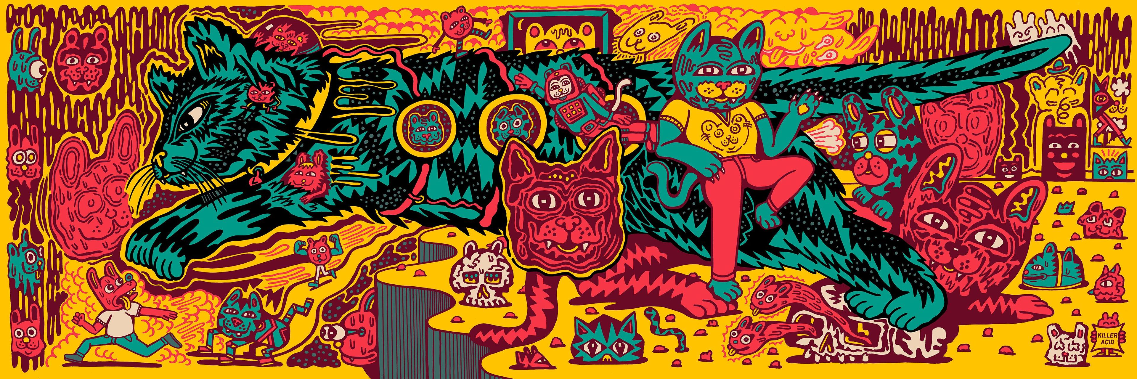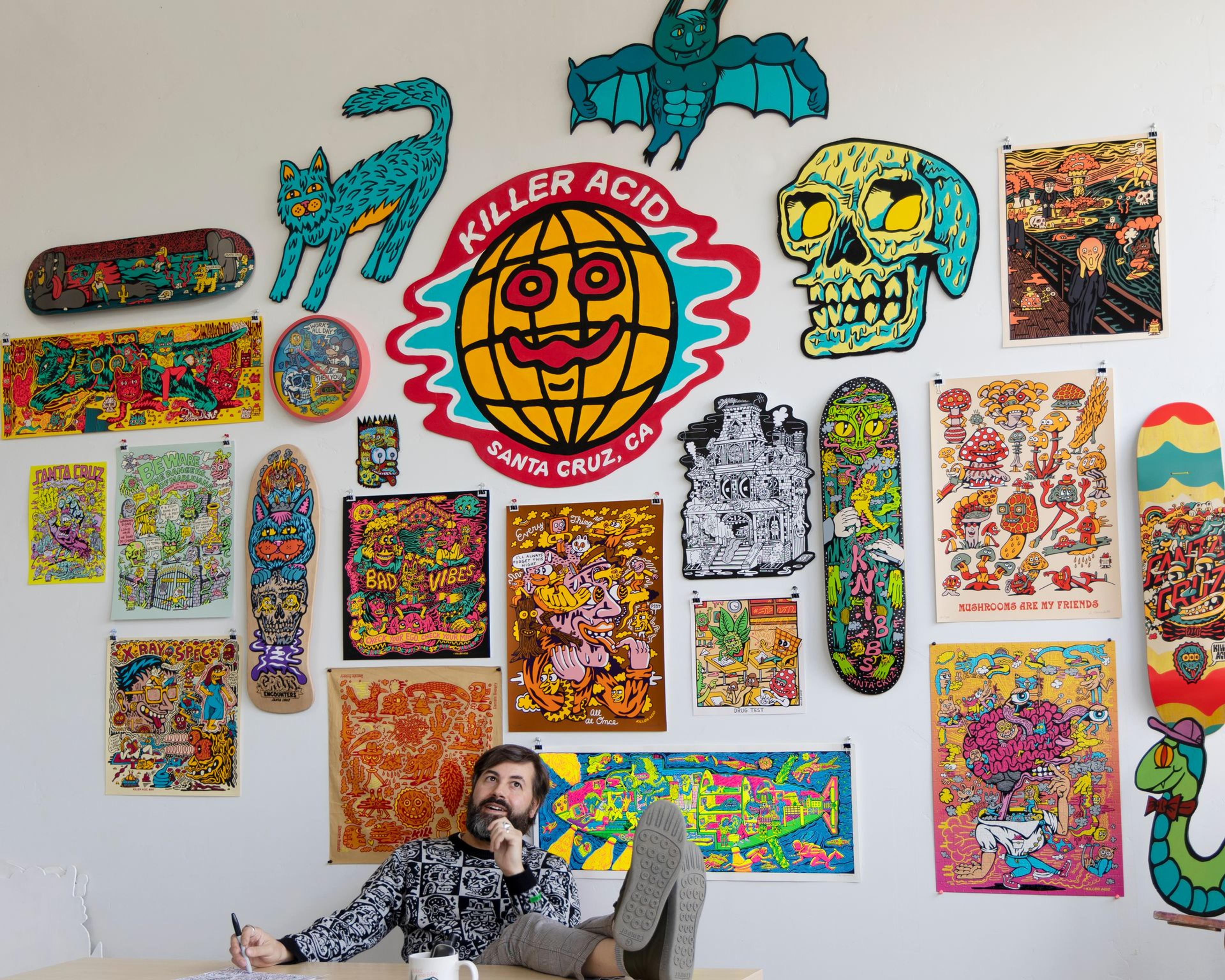 Hey Dave, thanks for having me. Killer Acid is an art project I embarked on 13 years ago, but something I'd been thinking about in one form or other since I was a teenager. It started in a tiny room in Brooklyn and grew super slowly over the years into what feels like a proper brand. Currently we come to find ourselves located in Santa Cruz, CA in a 2500 square foot studio slash warehouse. We make paintings here, screen prints, digital artwork, and dabble in animation. We also design clothing and other merchandise. Always trying to think up new weird shit.