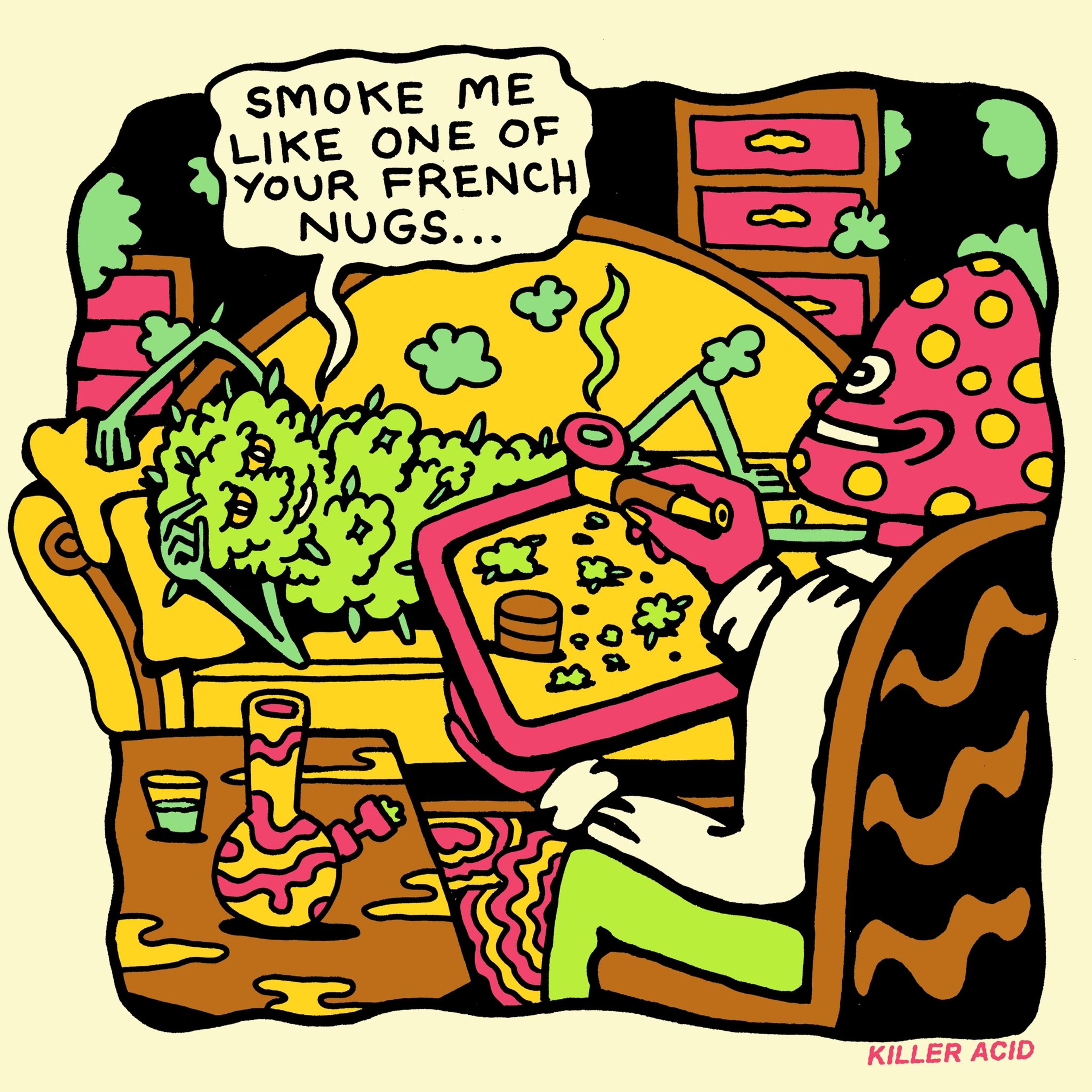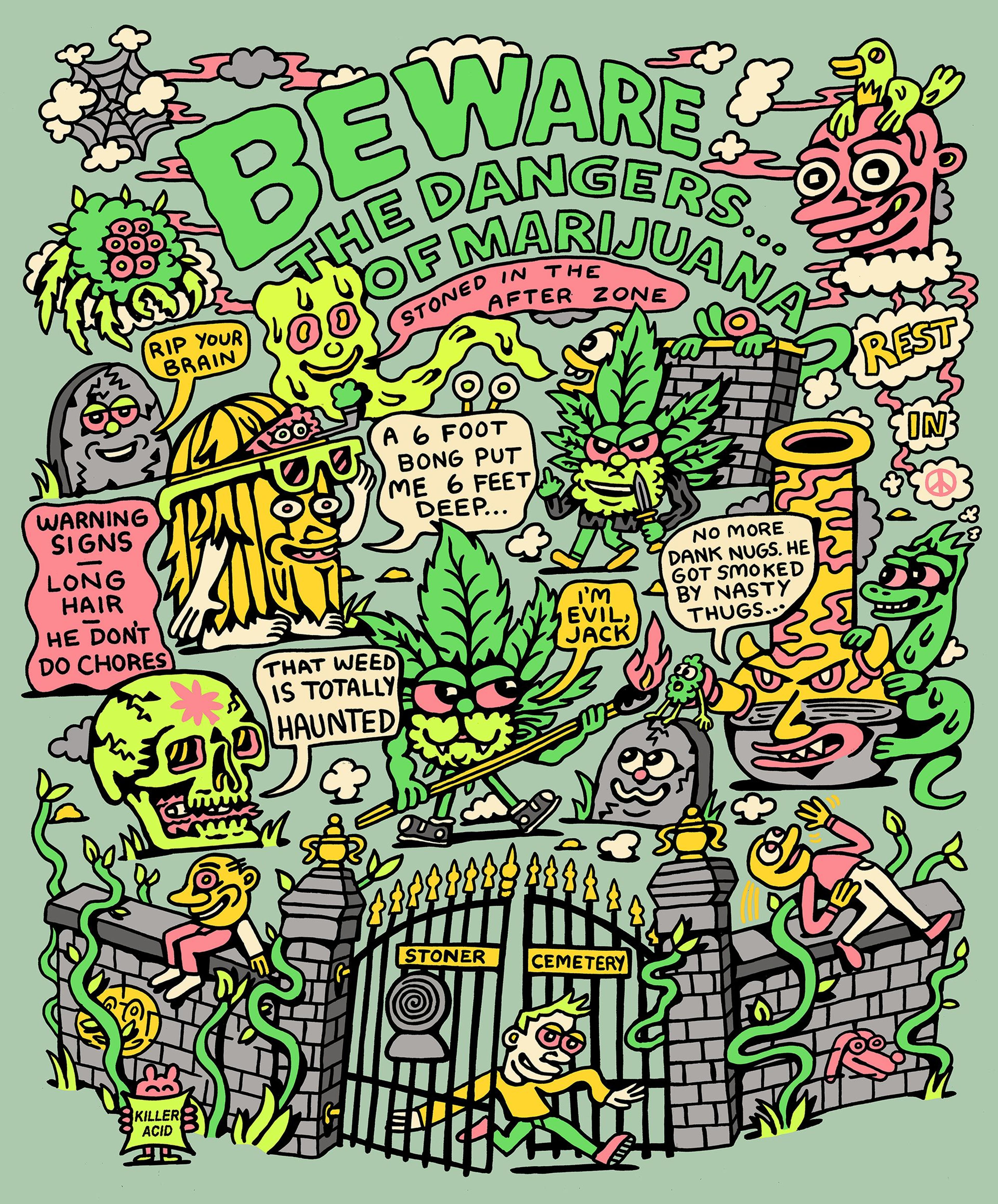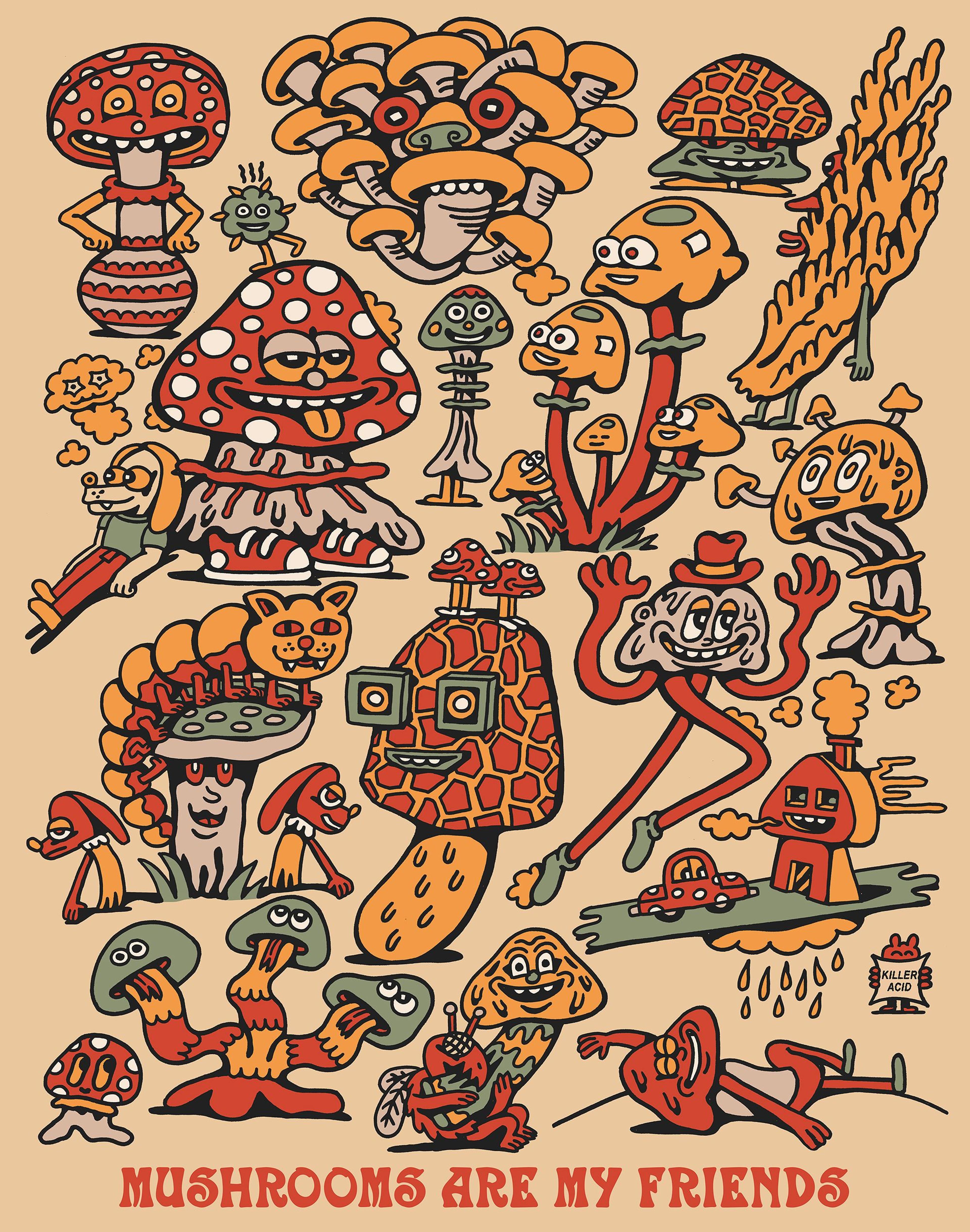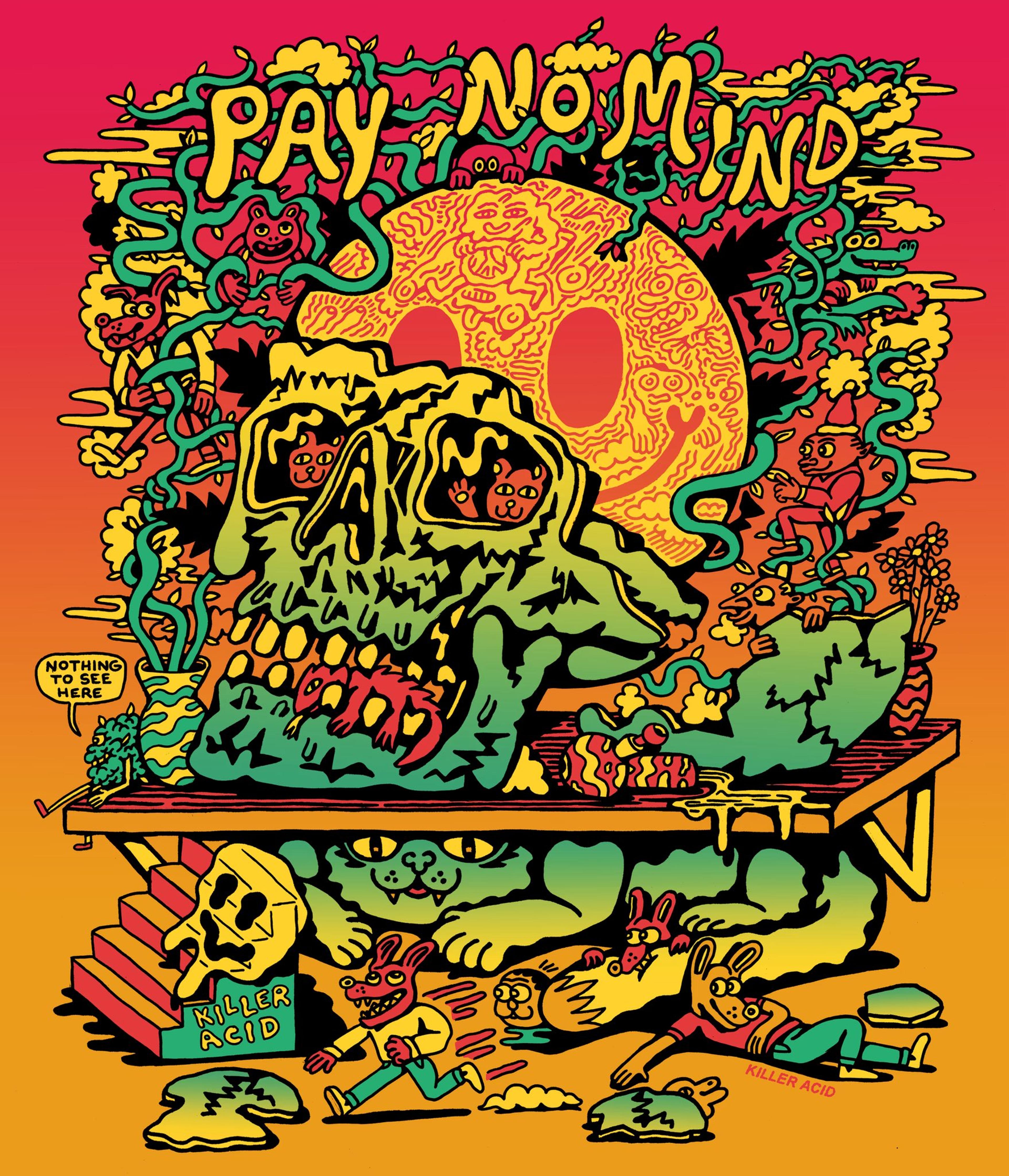 Hey Dave, thanks for having me. Killer Acid is an art project I embarked on 13 years ago, but something I'd been thinking about in one form or other since I was a teenager. It started in a tiny room in Brooklyn and grew super slowly over the years into what feels like a proper brand. Currently we come to find ourselves located in Santa Cruz, CA in a 2500 square foot studio slash warehouse. We make paintings here, screen prints, digital artwork, and dabble in animation. We also design clothing and other merchandise. Always trying to think up new weird shit.