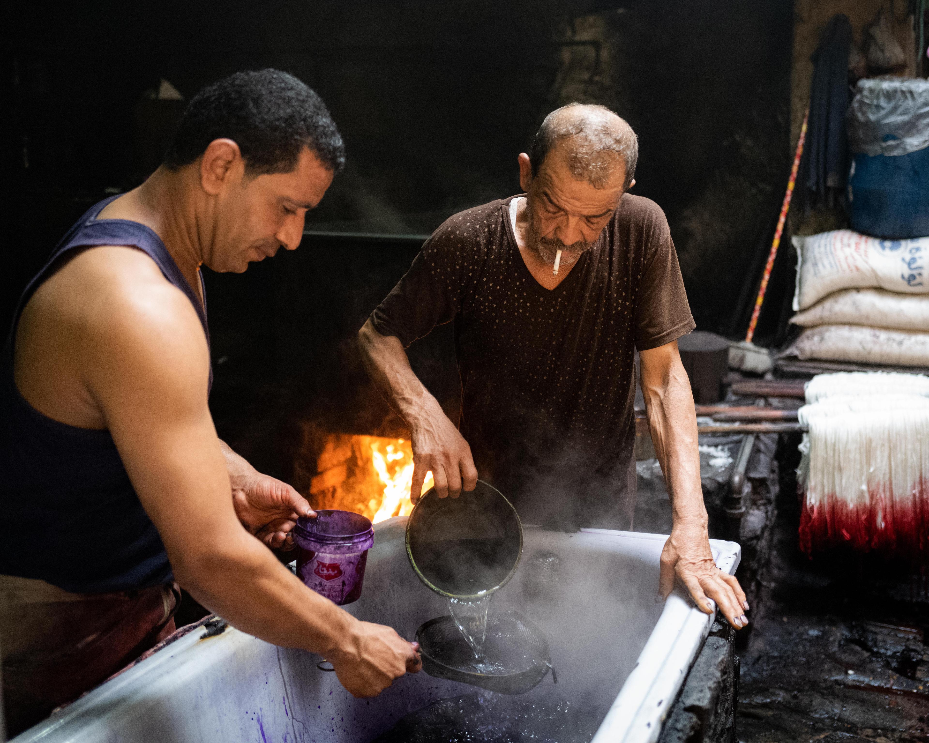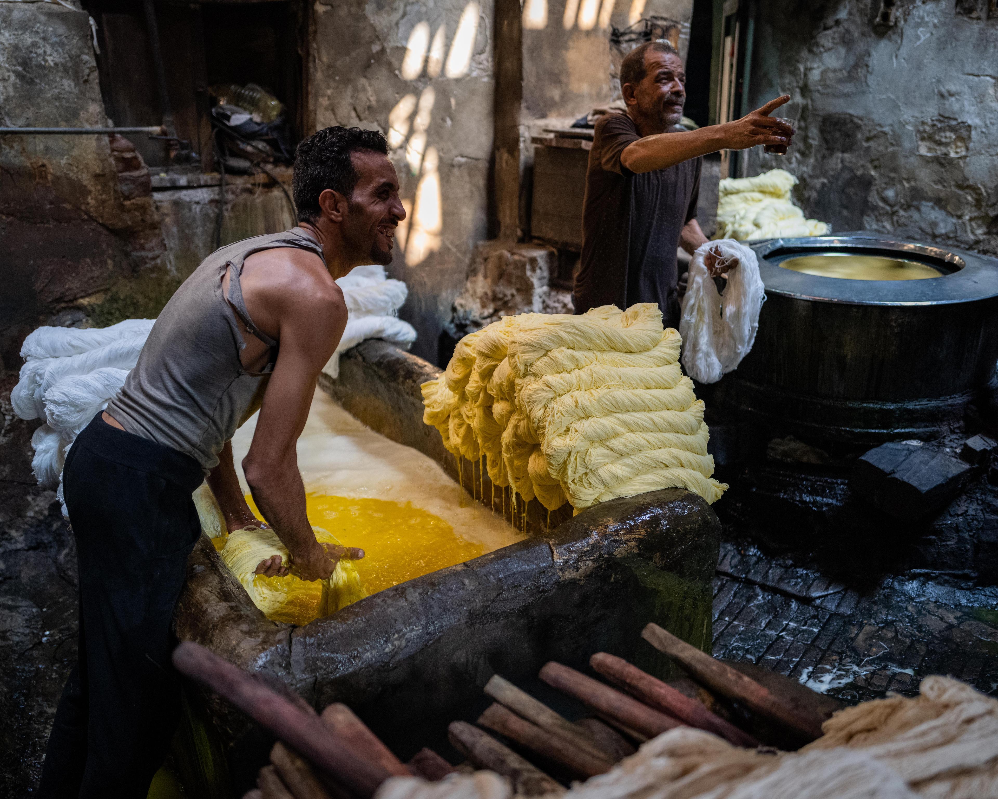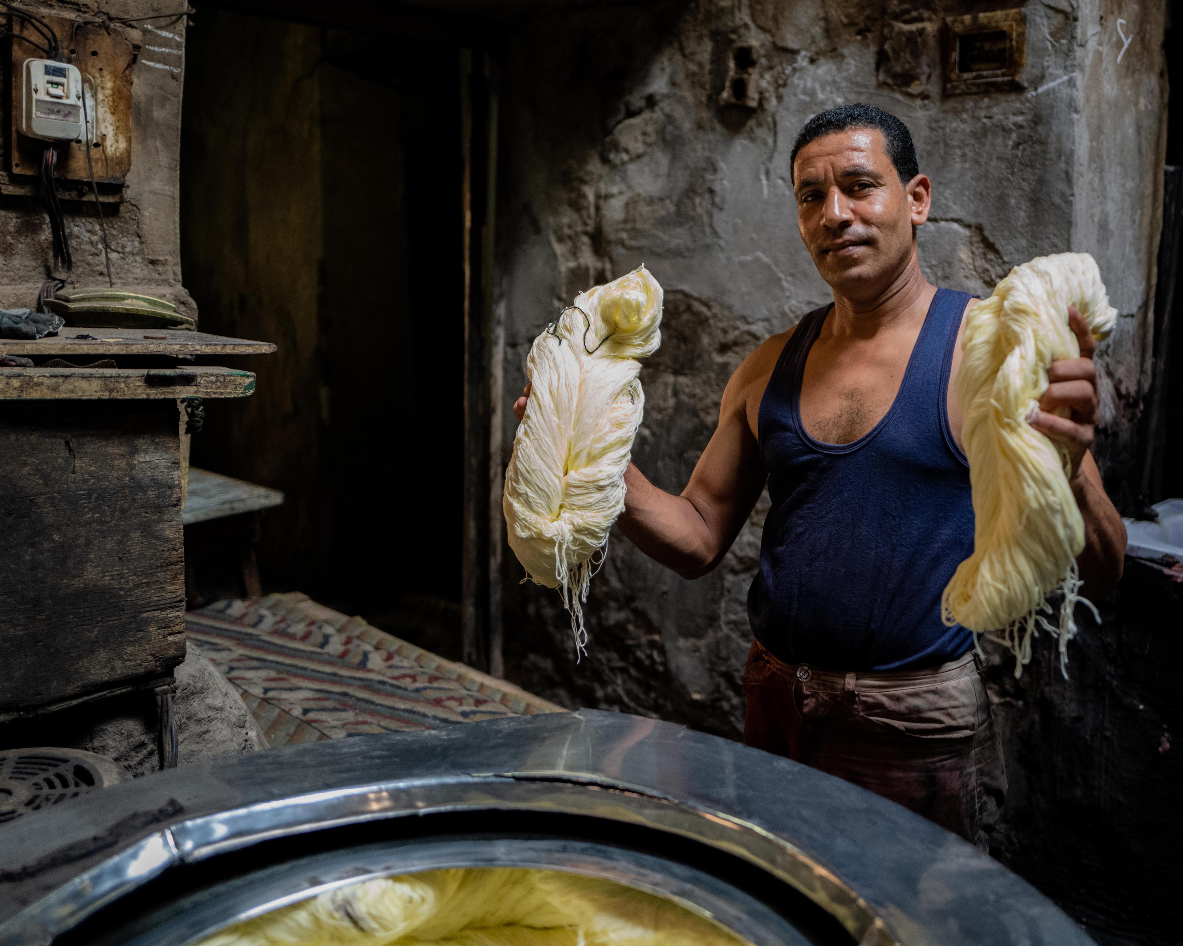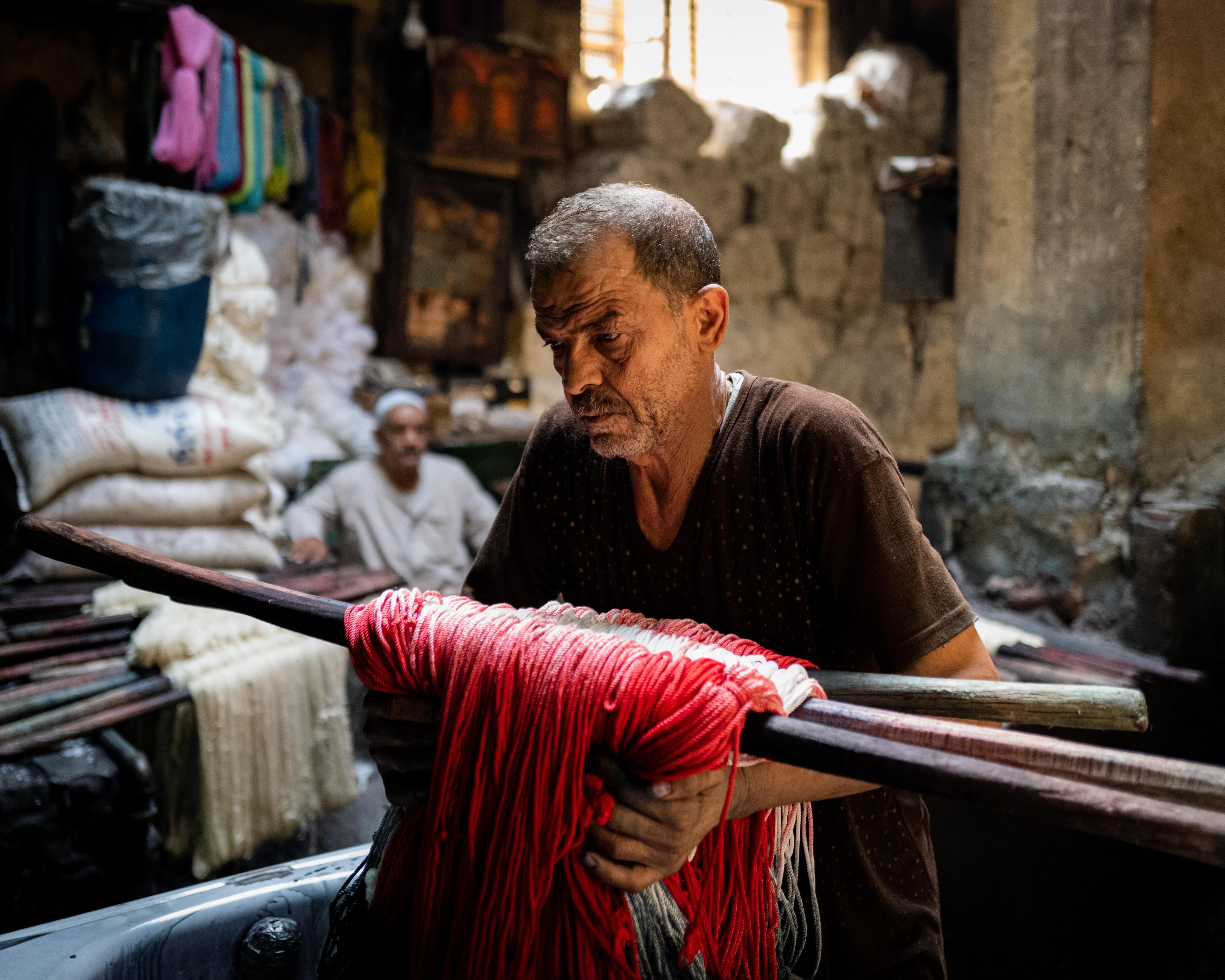 Salama “Hag” Mahmoud’s dye house is the oldest in Cairo, Egypt and he uses dyeing techniques that go back to pharaonic period. Operating since 1901 in the historic El-Darb El-Ahmar neighborhood of Cairo and rented by Salama in 1975, his small business processes textiles such as silk, cotton, and wool to produce shoelaces, carpets, towels, among other speciality garments.
