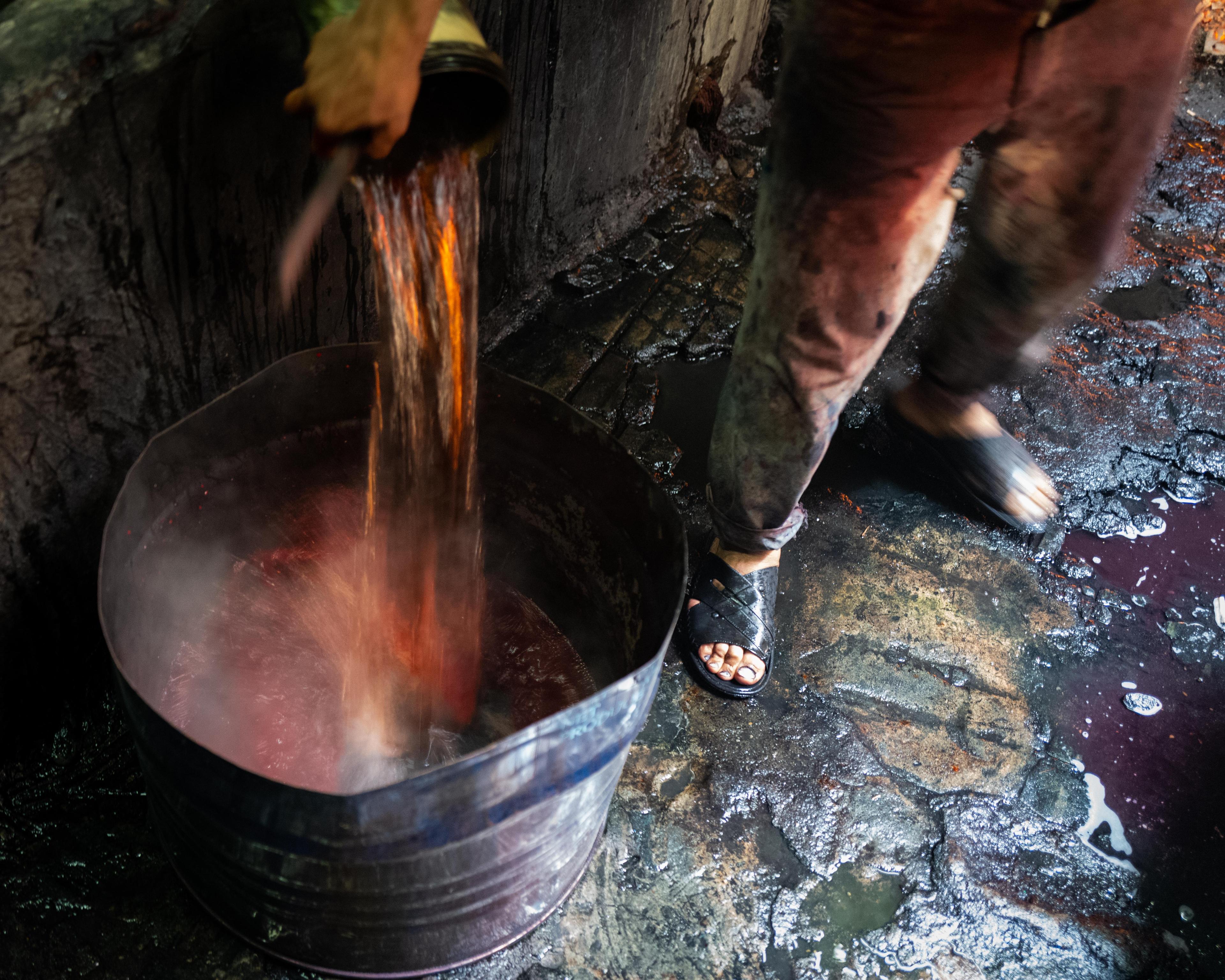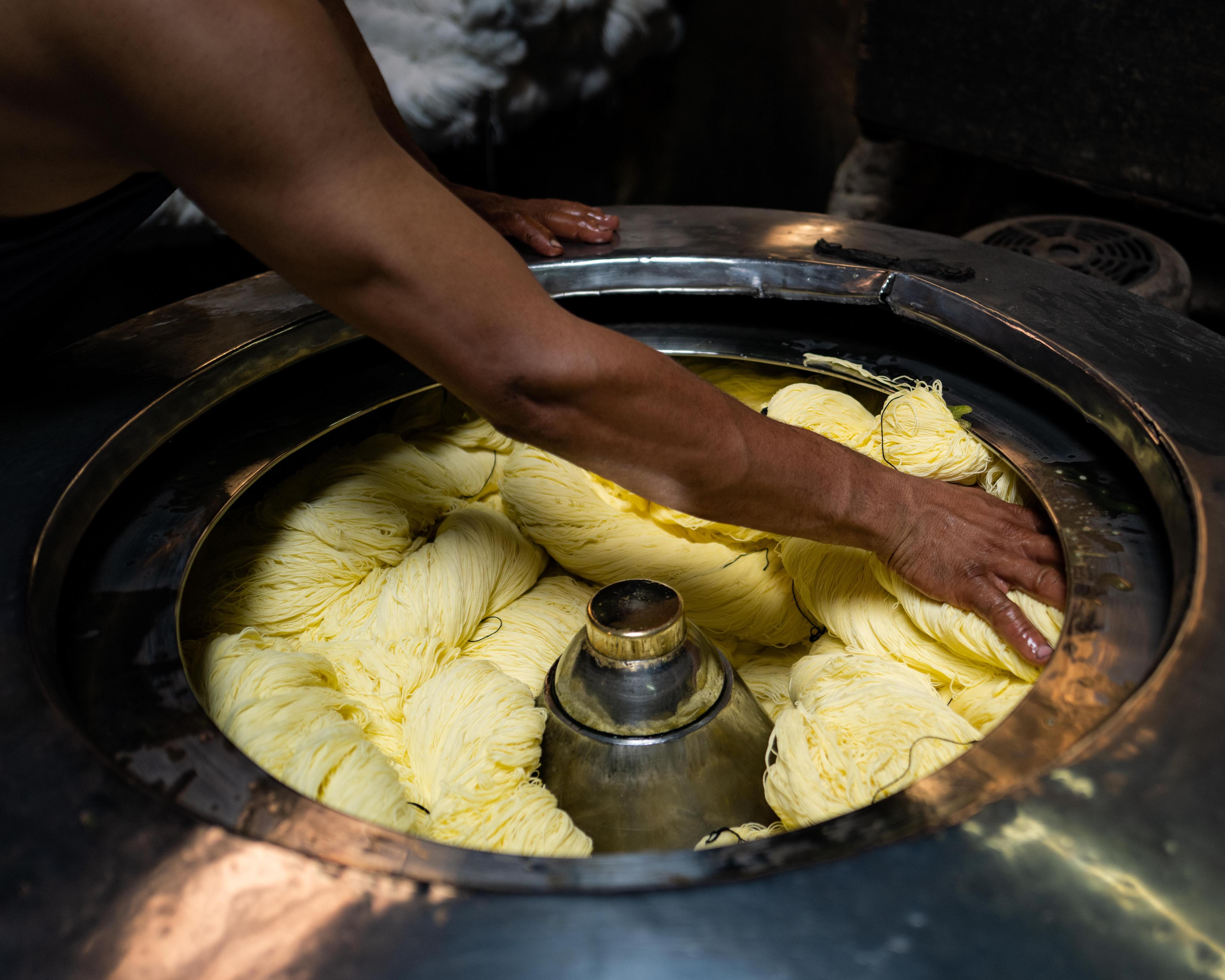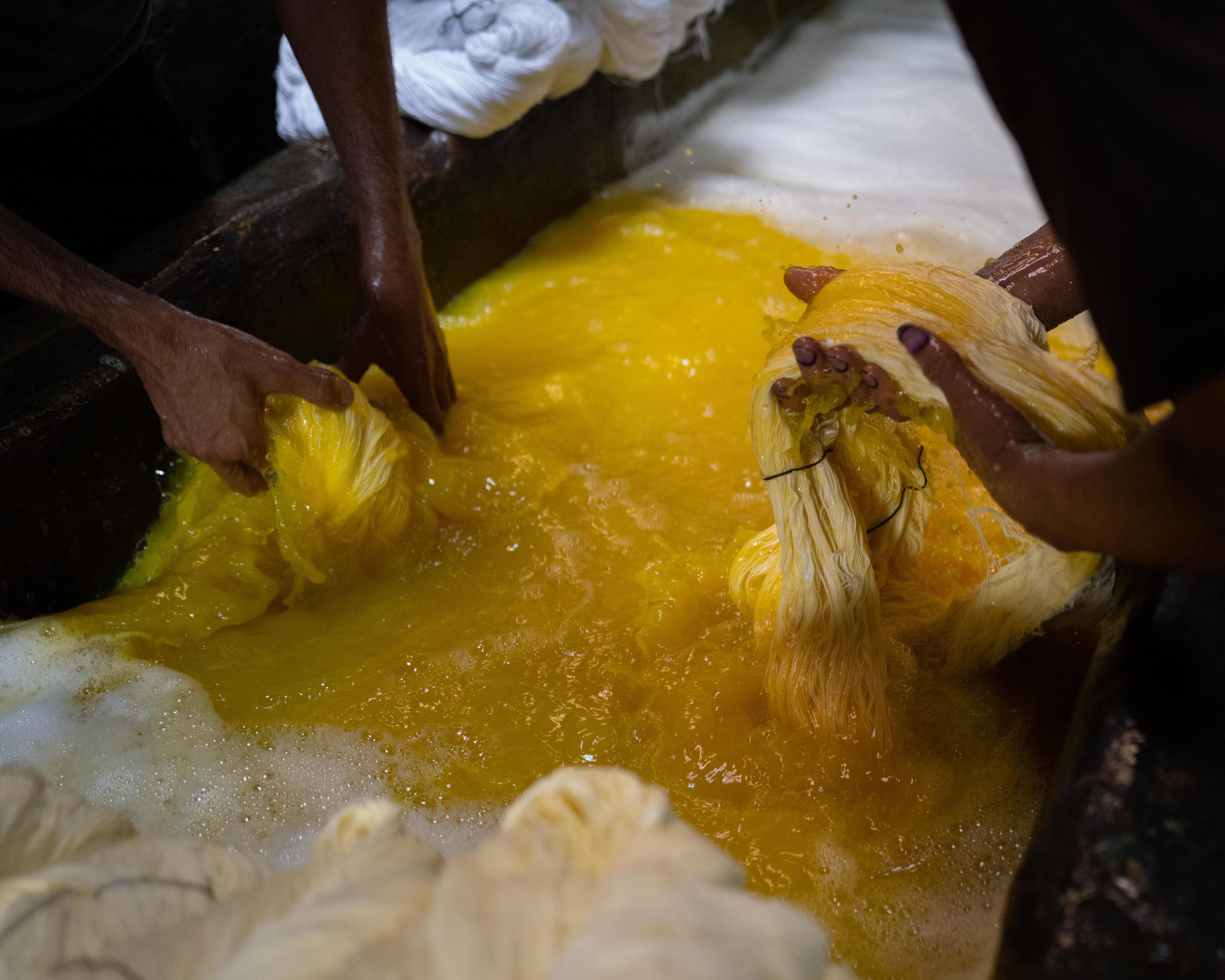 2: Submerge thread into dying pool that consist of hot water and chemicals to apply color;