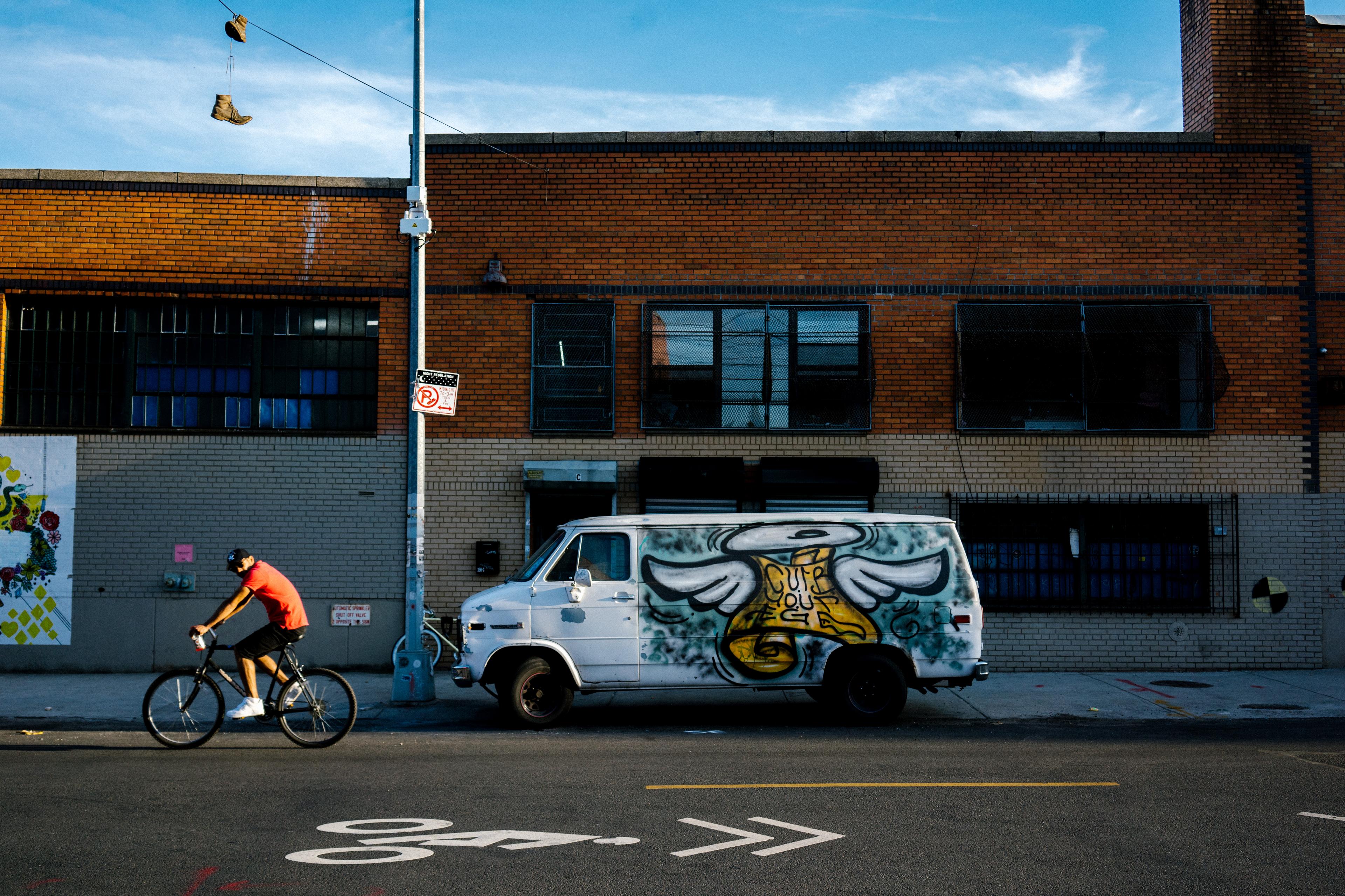 Whether I’m building my collection of graffiti vans, or simply trying to incorporate graffiti into my street photography, I always try to include a human element when possible. I’ll wait patiently for an interesting subject to pass by, sometimes interacting with the environment in an unique way. Other times, all I can hope for is someone riding by on a bike. If all else fails, I’ll take a static photo for my personal collection.