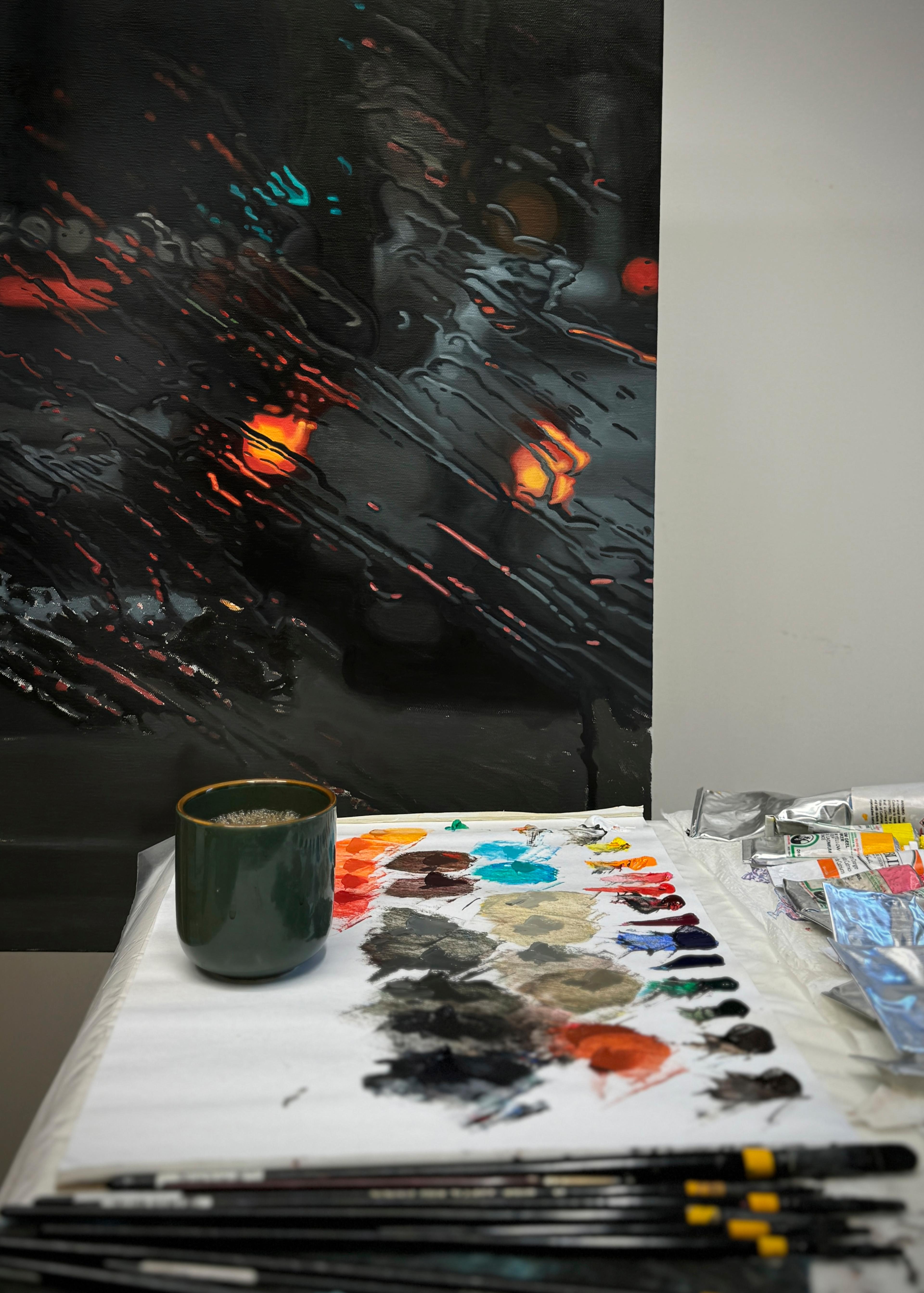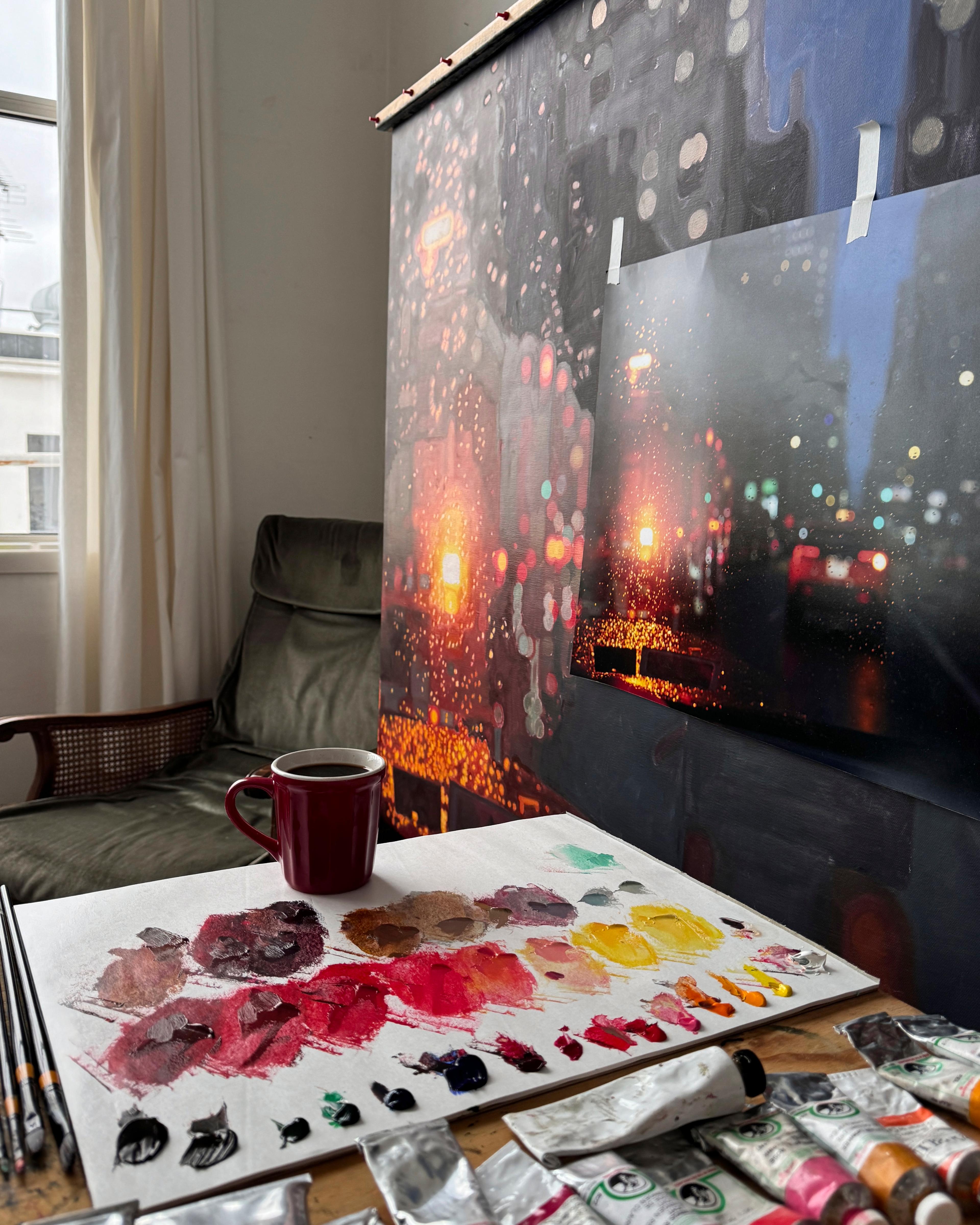 Beautifully said. I’m obviously a huge fan of the scenes you create, and I love the rain for many of the reasons you describe. Can you tell us a bit about the process? The paintings you make are so realistic, they almost look photographic, it is so satisfying to zoom in and see the smallest strokes coming together to create something so seamless. How do you make these paintings?