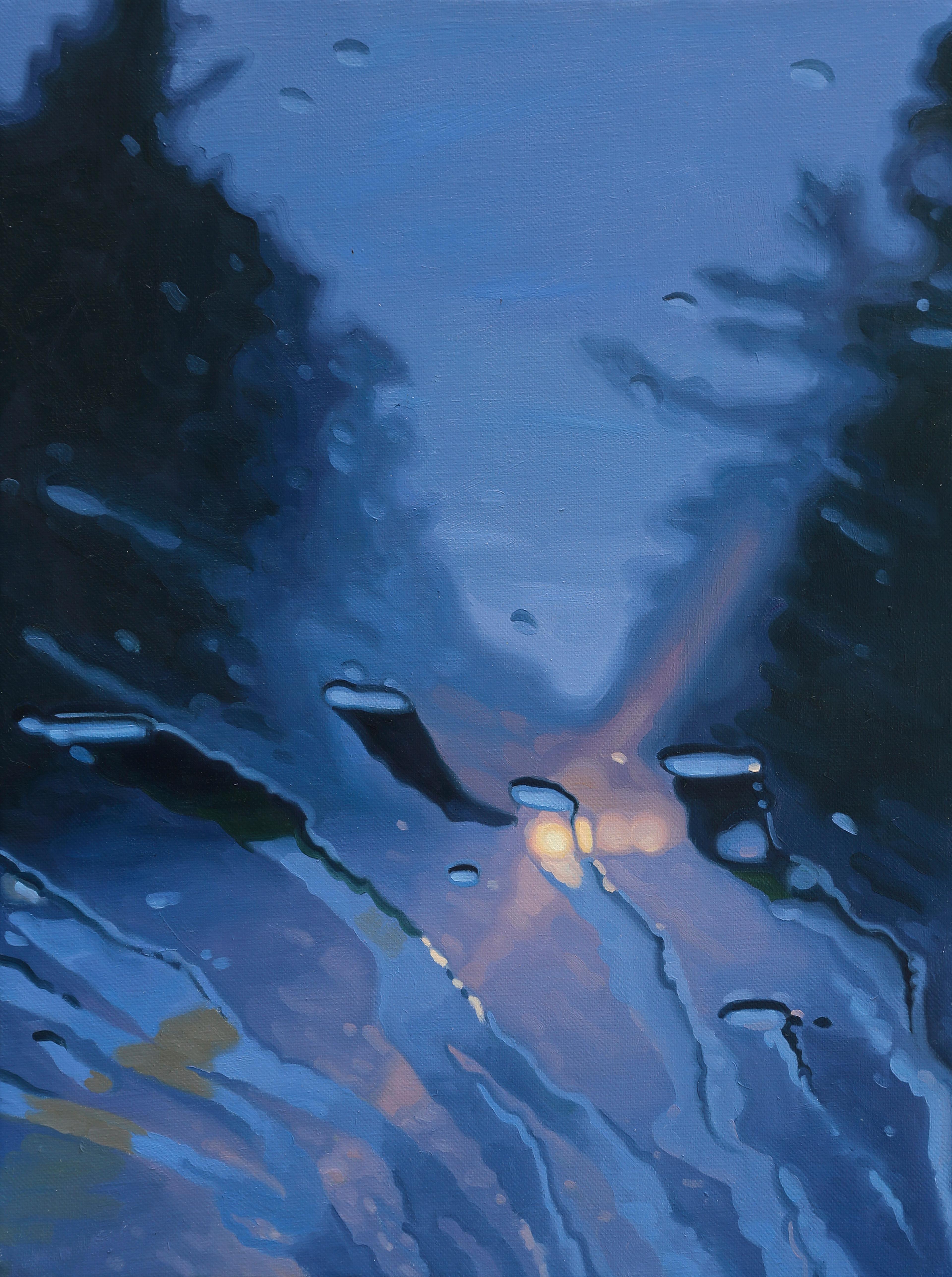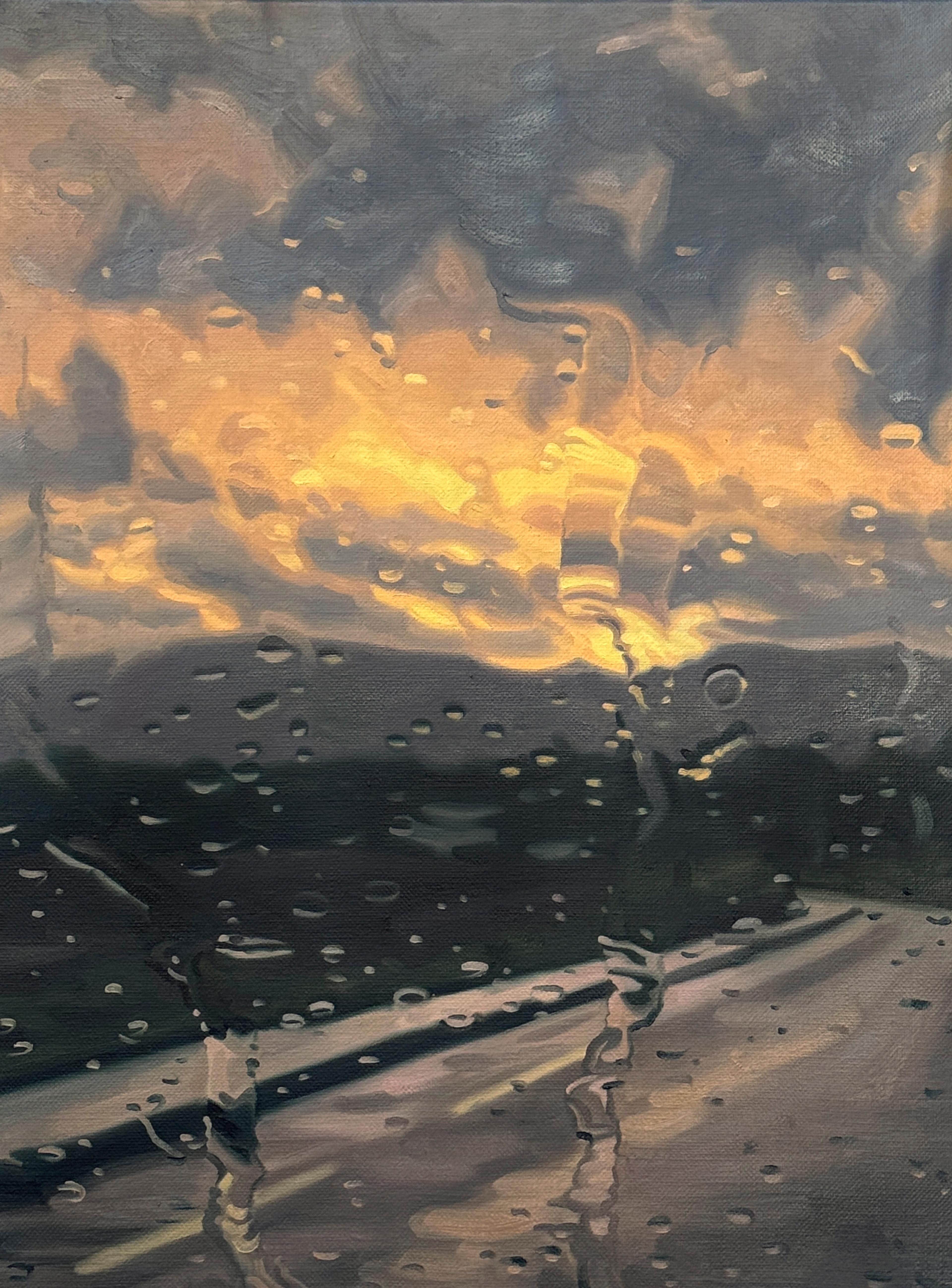I am a painter, but I use photography in work, and I also do drawing and watercolor. For the past several years, I have been focusing on the views you see from inside of the car while driving, and the rain hitting the windshield creates a fluid lens for seeing the world outside.